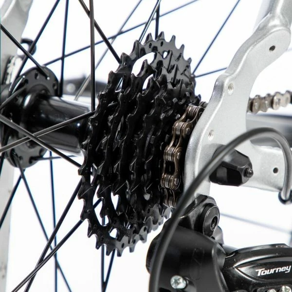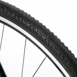 Pneus hybrides B’TWIN SPORT 700 X 32. La bande de roulement est finement cramponnée pour le rendement, les bords du pneus ont des crampons plus gros pour plus de grip en virage sur terrain stabilisé, meuble ou sur les graviers.